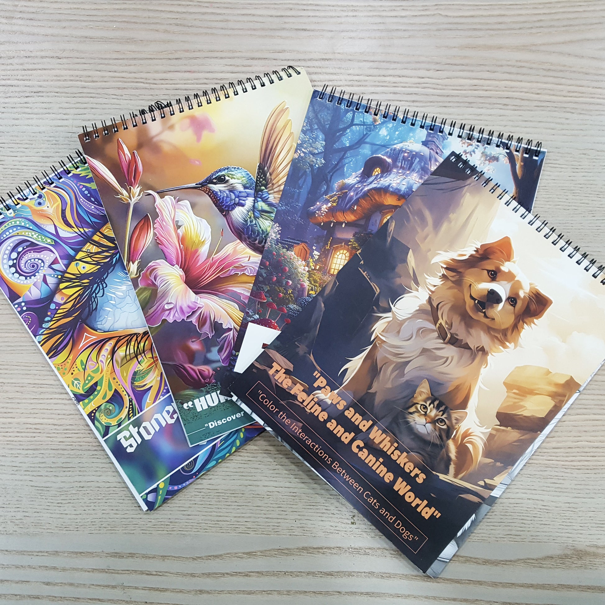 A4木顏色填色本奇幻系列有4個款式,分別是貓狗樂園、峰鳥天堂、童話小屋及型格人物主題,金屬雙綫圈釘裝,可360度摺疊。