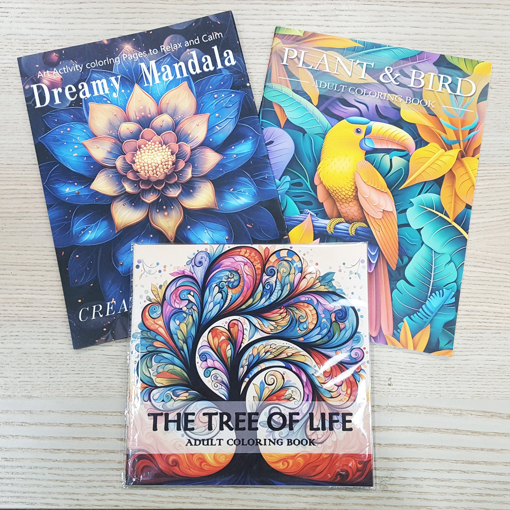 A4木顏色填色本療癒系列B有3個款式,分別是迷人曼陀羅、花鳥叢林及生命之樹(A5)主題。雙頁內頁16頁精美圖畫,除了適用木顏色填色外,Marker及水彩筆都適用。