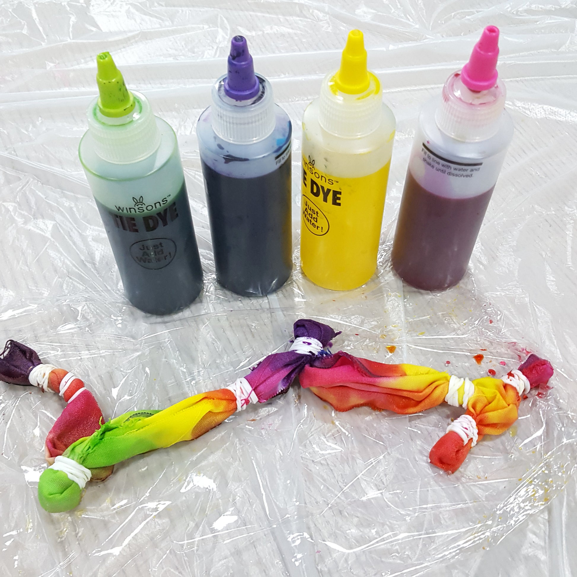 【DIY Homemade Tie Dye Rainbow Kit 5 Colours】:紮染是一種千變萬化的設計,使用不同的物料放進布裏再用橡皮筋紮實,紮成不同的形態,倒上紮染顏料,便可以擁有特別的效果在布上呈現,非常好玩。使用簡單,顏色色彩繽紛,安全無毒性,非常適合大人、小朋友一起設計。