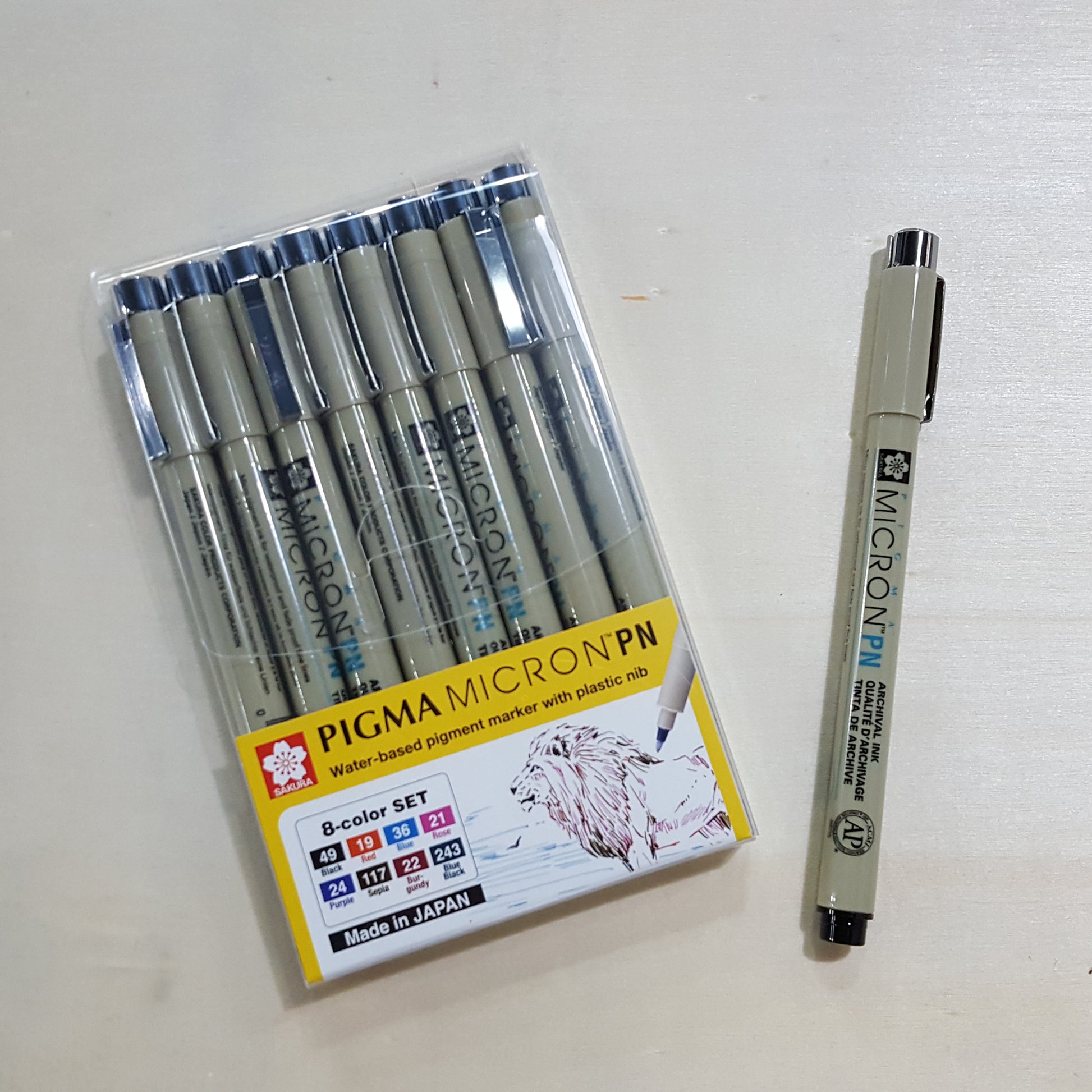 櫻花牌PN代針筆,塑料筆尖(plastic nib),可以透過書寫力度控制線條粗幼,油墨快乾,使用薄的紙也不易透底,適合素描/設計製圖,有單支裝黑色及8色套裝可供選購。